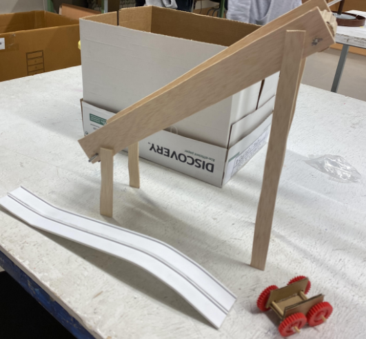 Aquí tenemos una foto de como estamos haciendo la maqueta. Se puede ver la rampa de subida ya hecha, la de bajada a la que le estamos dando forma y también tenemos el diseño inicial de un cochecito pequeño para que circule por la atracción.