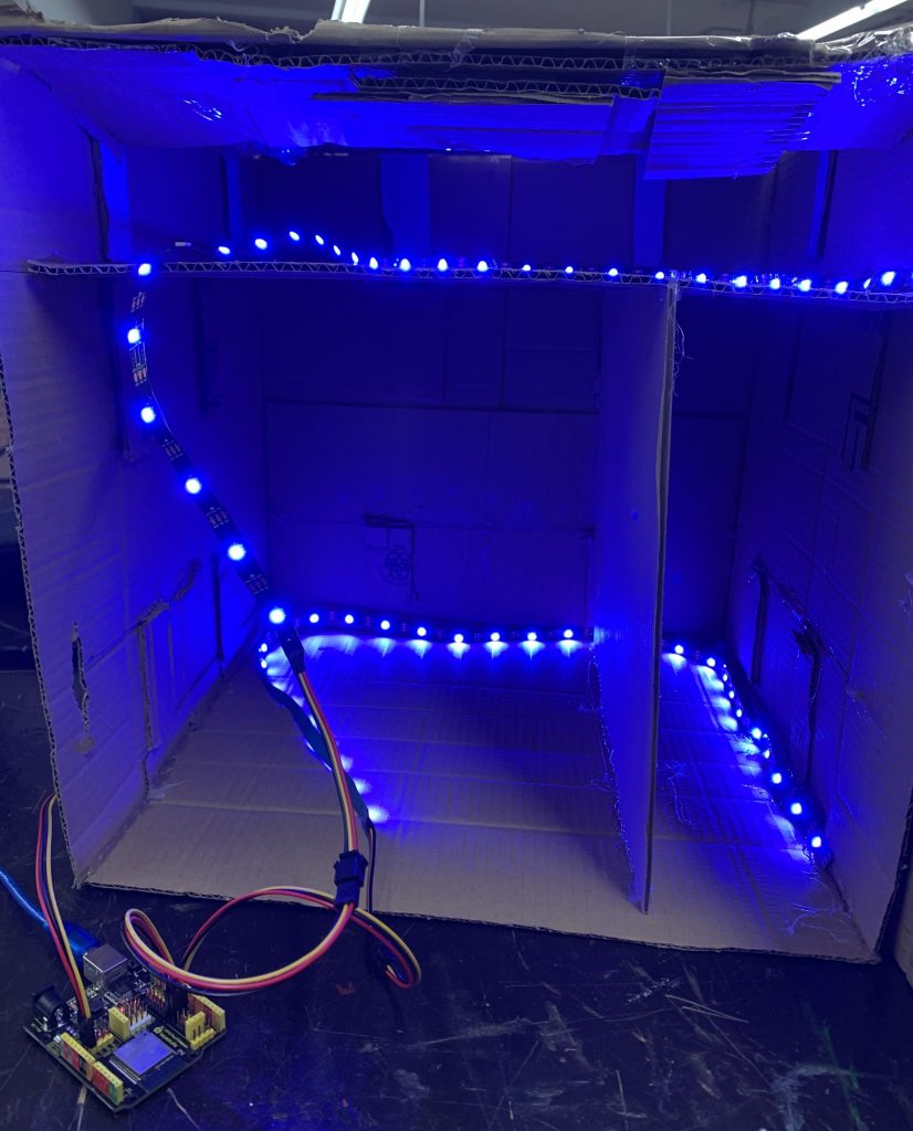 Aquests dies estem acabant de tallar i muntar la caixa, que al final serà de fusta fina ja que és massa gran per imprimir-la a la impressora 3D. També hem programat uns leds de color blau fosc que s’engeguen quan un sensor detecta que s’ha obert la porta.