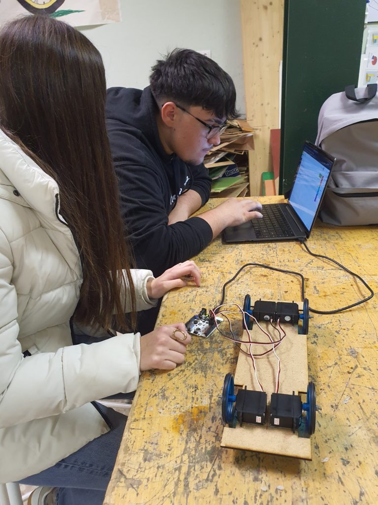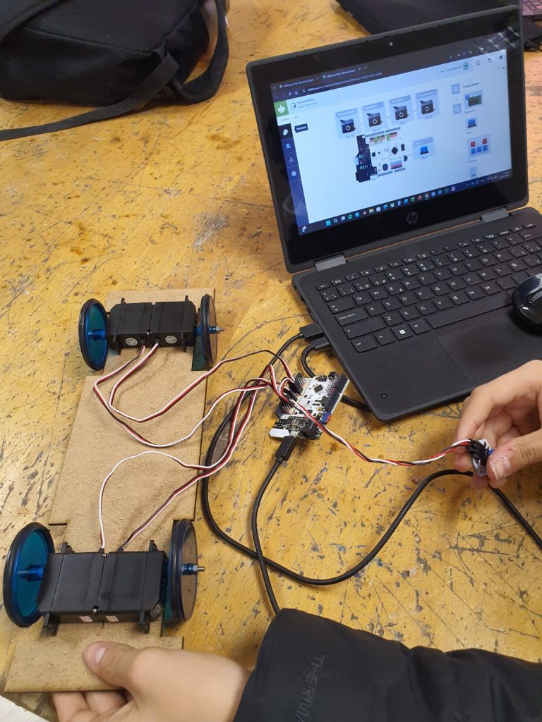 Amb el sistema mecànic muntat, s’ha iniciat la fase de programació dels quatre servomotors de rotació contínua mitjançant l’entorn Bitbloq Robòtics. L’alumnat ha treballat la configuració dels motors i la seva coordinació, entenent la importància del control de velocitat i sentit de gir per aconseguir un desplaçament coherent del bus.