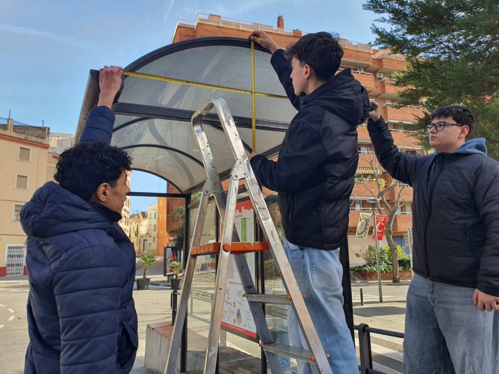 Dins del projecte del bus urbà de Valls, l’alumnat de 4t d’ESO ha realitzat una sortida a la parada del Portal Nou de Valls amb l’objectiu d’analitzar-la i prendre’n les mides reals. En aquesta sortida s’han mesurat les dimensions de la marquesina amb coberta en forma de volta, dades que serviran com a base per elaborar els plànols en 3D.