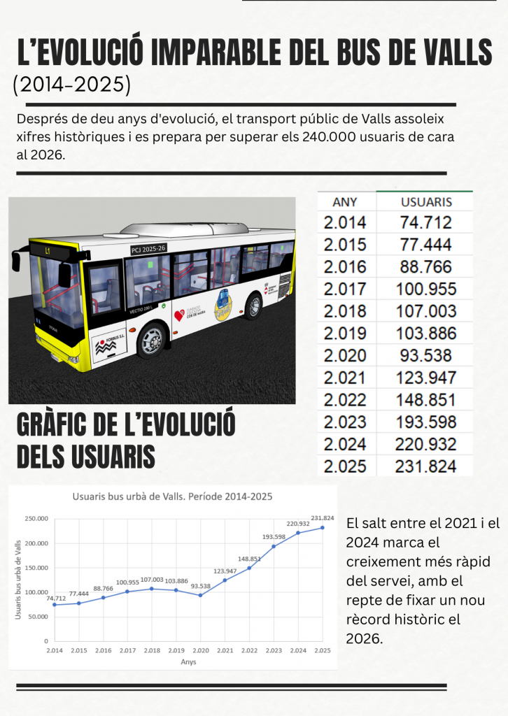 A partir d’articles del setmanari El Vallenc, els alumnes van poder extreure dades corresponents al període 2018-2024. Aquesta informació s’ha completat amb dades addicionals per tal de construir una sèrie més àmplia, que abasta des del 2014 fins al 2025. Un cop recopilades, les dades es van introduir en un full de càlcul, que ha permès elaborar una gràfica clara i entenedora sobre l’evolució de l’ús del bus urbà.