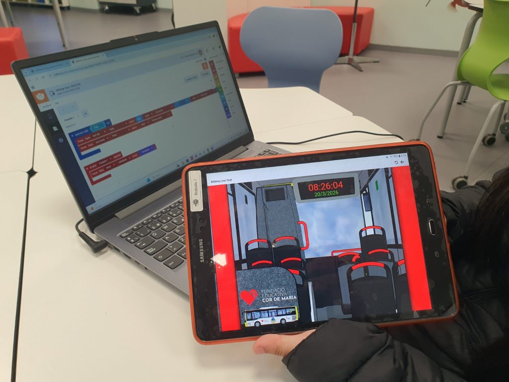 Com a part del projecte del bus urbà de Valls, l’alumnat de 4t d’ESO està treballant en la programació d’una aplicació destinada a indicar l’hora i el dia en temps real dins del bus. Aquesta app permet visualitzar de manera clara i actualitzada l’hora i la data en cada moment, simulant el funcionament d’un rellotge digital integrat a l’interior del vehicle.