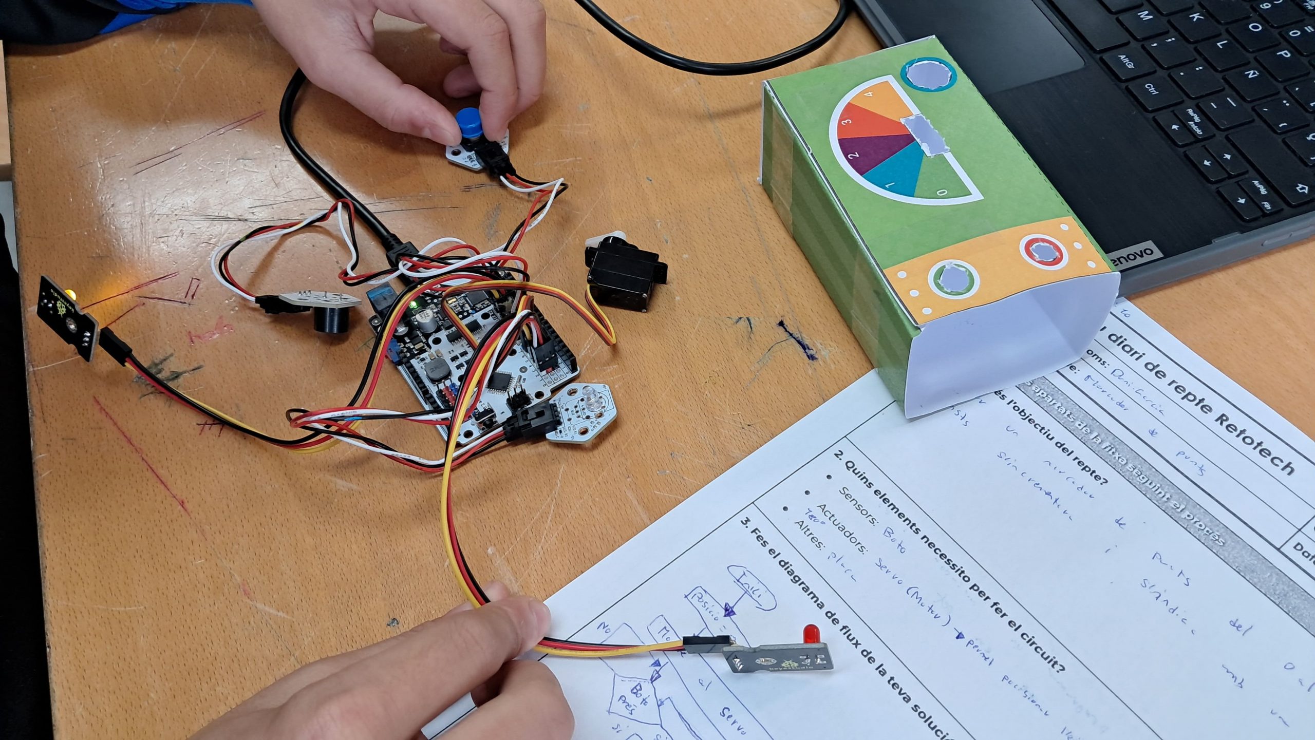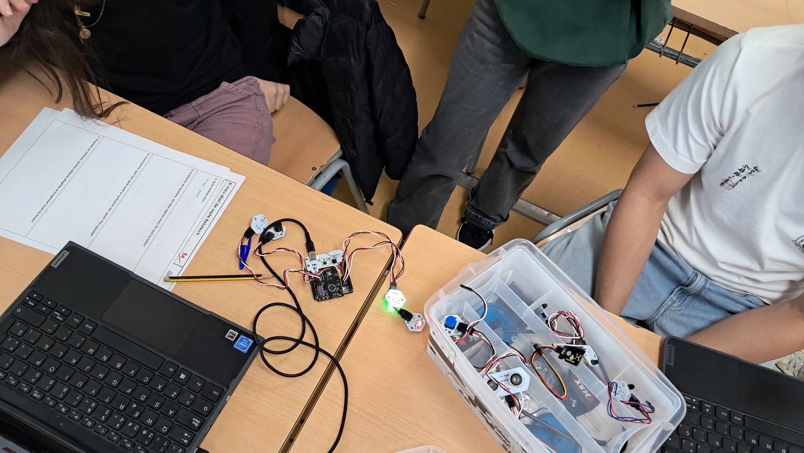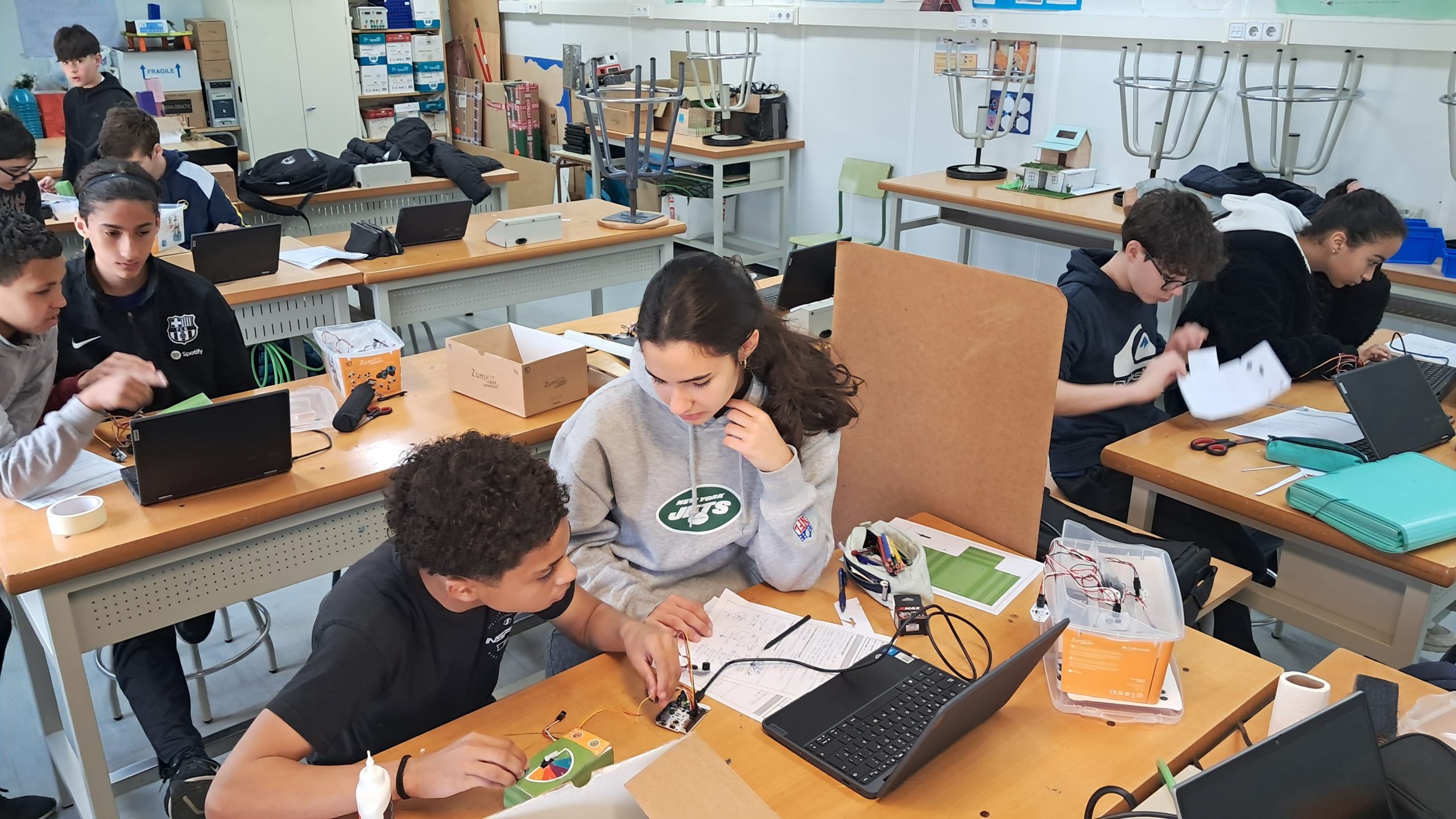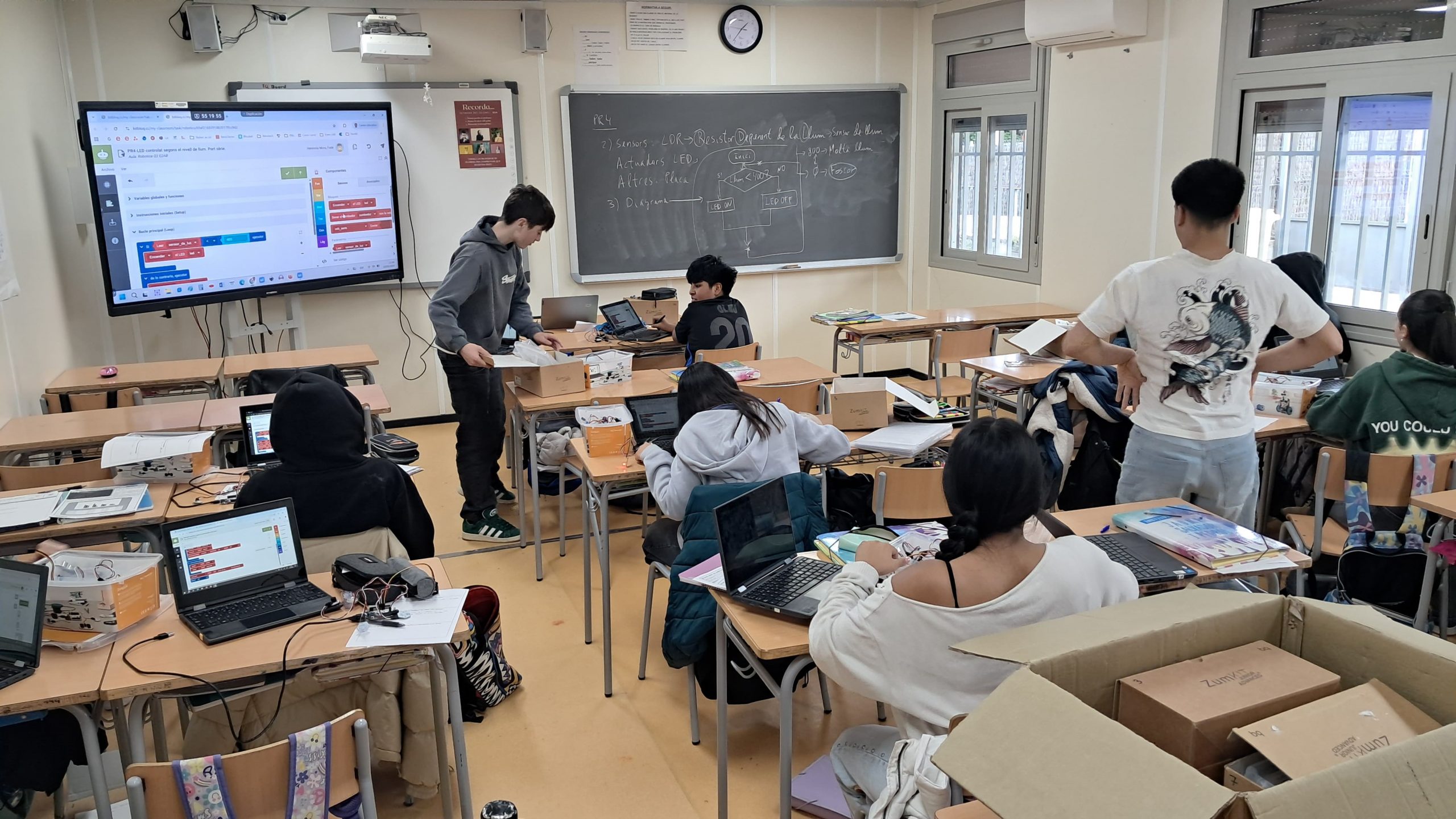 Los alumnos de 2º ESO de la optativa de Robótica y programación del Instituto Jaume Salvador i Pedrol de Sant Joan Despí (Barcelona) hemos estado haciendo deferentes retos para familiarizarnos con la placa ZumCore 2.0 y los diferentes sensores y actuadores disponibles: alarmas, lámparas controladas automáticamente según la intensidad de luz, atracciones de feria, marcadores automáticos,… También hemos aprendido las instrucciones básicas de programación en el entorno BitBloq.