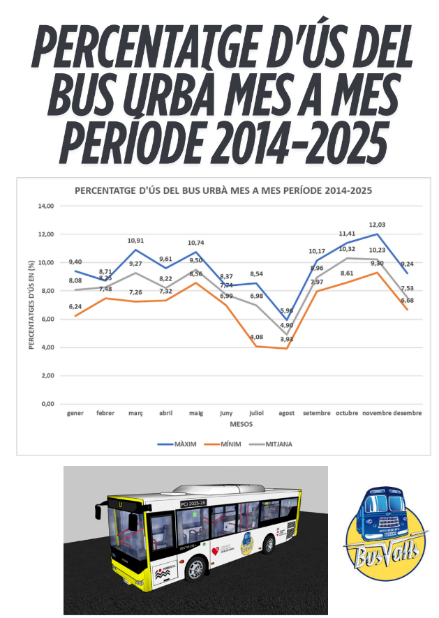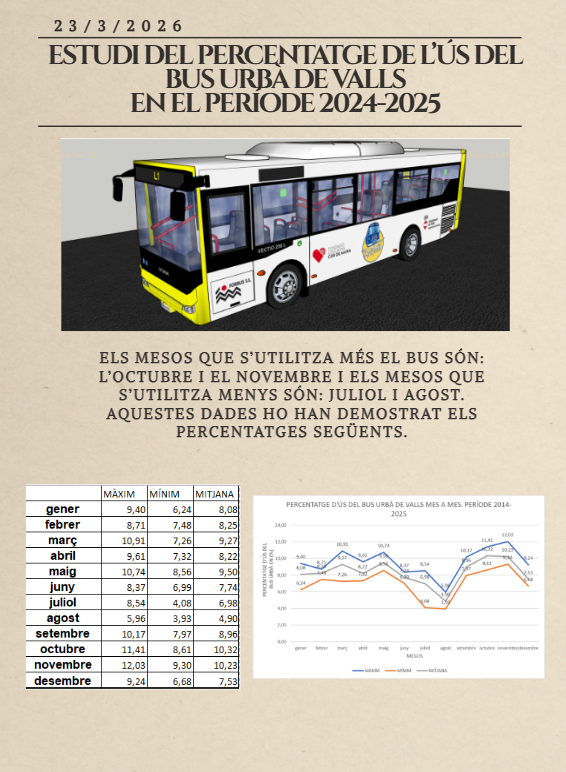En el marc del projecte del bus urbà de Valls, l’alumnat de 2n d’ESO ha aprofundit en l’anàlisi del percentatge d’ús del servei al llarg de l’any, estudiant les dades mes a mes per al període 2014-2025.