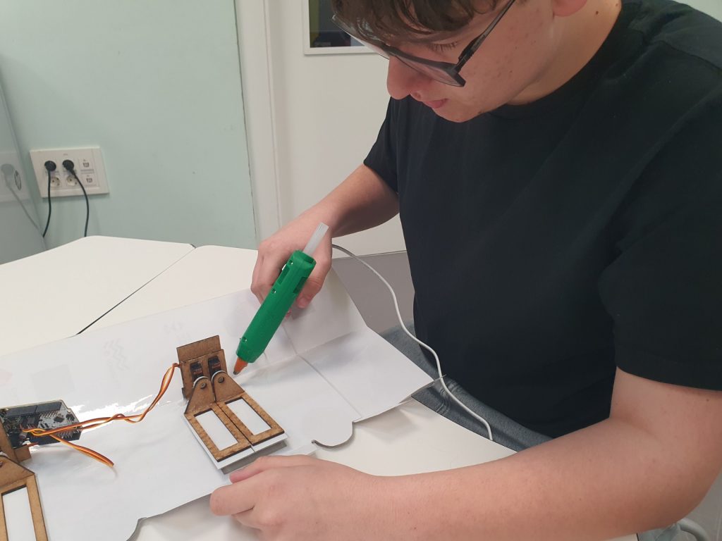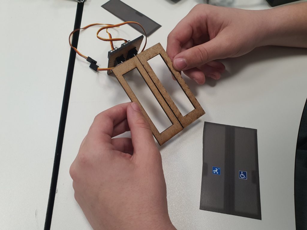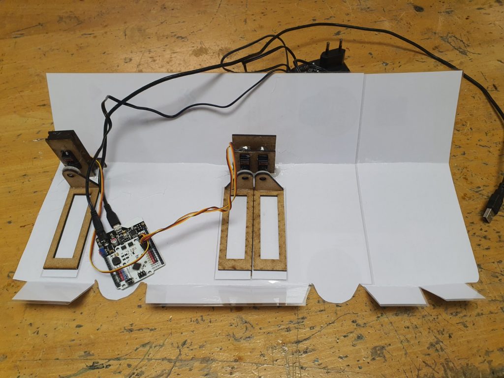 Inicialment, es va dur a terme la modelització de les portes amb fusta DM3 i la seva connexió a servomotors, tot comprovant el sentit de gir necessari perquè funcionessin de manera sincronitzada. Un cop validat aquest funcionament, es va completar el muntatge definitiu i la programació per controlar l’obertura i el tancament de manera precisa.