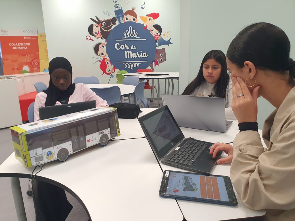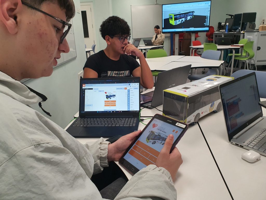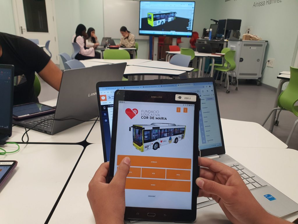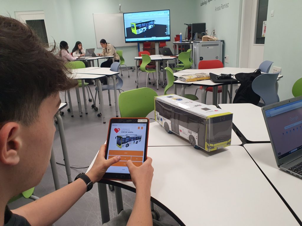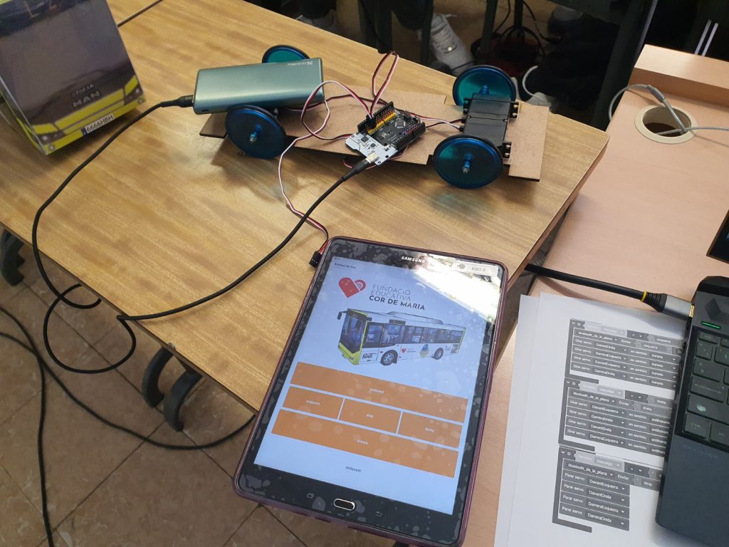 En aquesta fase, l’alumnat ha desenvolupat una aplicació mòbil utilitzant l’entorn Bitbloq Apps, amb l’objectiu de controlar el moviment del bus de manera més intuïtiva i versàtil. Aquesta app permet la connexió via Bluetooth amb dues plaques Bitbloq Robòtics instal·lades a la maqueta: una dedicada al control de les rodes davanteres i una altra per a les rodes del darrere.